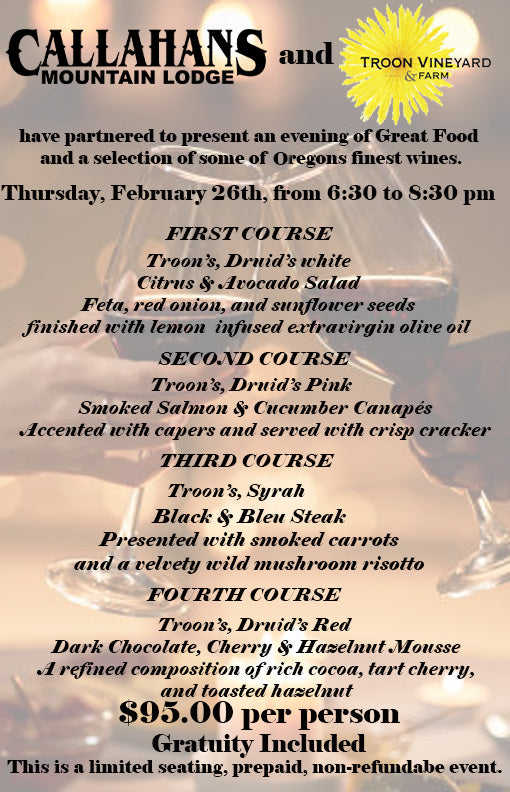 Callahan's Mountain Lodge and Troon Vineyard have partnered to bring you this month's wine pairing dinner